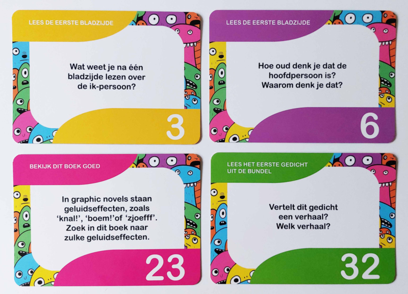 De leerlingen gebruiken geen dobbelstenen, maar lopen via een kleurpatroon van vraag naar vraag. Doordat ze hun antwoorden moeten opschrijven, moeten ze nadenken over de formulering. Tijdens het spel lezen ze regelmatig een bladzijde of een gedicht om inhoudelijke vragen te kunnen beantwoorden.